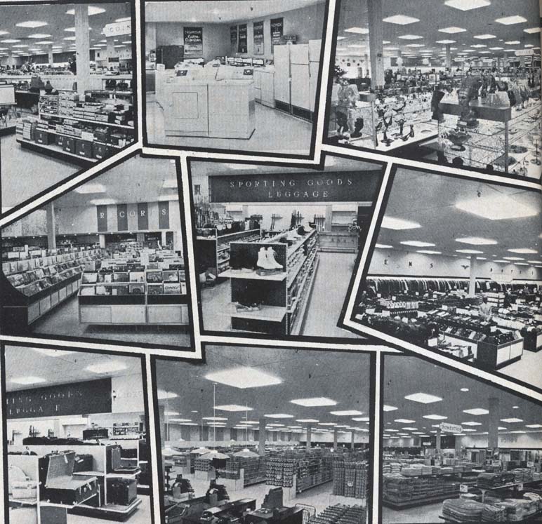 Two locations opened in Des Moines, Iowa during 1959 or maybe 1960, and they were the very first discount department stores I'd ever been to. They didn't stick around very long however, having closed around 1962 or 1963. They did stay longer in other states. Look again at the color picture of the Chicago store with that HUGE turnout. That was back in 1962. Two years later, I can just see a toy department shelf stacked high with freshly-cranked-out Crazy Clock games by Ideal and the first wave of 82-channel TV sets sharing space with the last gasp of 12-channel sets.