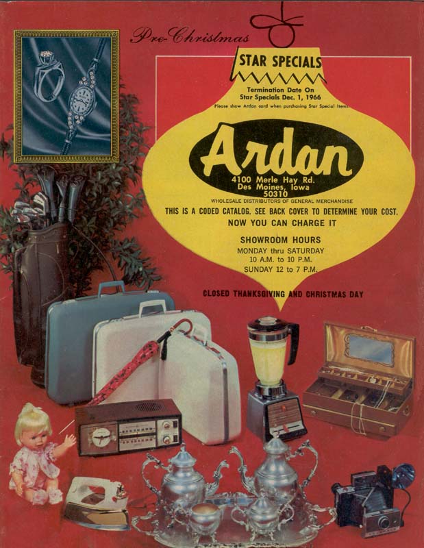 Just in time for Black Friday in November of 1966: one of Ardan's Pre-Christmas sale catalogs. Note the adorable Cheerful Tearful doll by Mattel and the elaborate-looking Polaroid camera on opposite sides at the bottom.