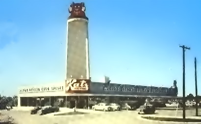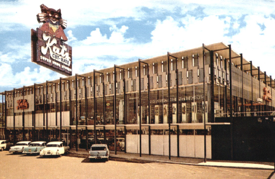Here is a later Katz store which opened on Metcalf Avenue in Overland Park, Kansas. Many features distinguish it from the others that were around: two floors of merchandise, an impressively modern exterior design...and doesn't that sign look like it's about to come crashing down on those three cars directly below it?