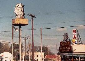 The Five Points Skagway in Grand Island was one of the the last of the independently-owned discount stores, having survived at least 40 years of change, closings and takeovers. Established in 1959, it was originally a unique mix of grocery, appliances, electronics and regular discount store merchandise, and the first time I'd seen it around the mid-1980s, it appeared to be virtually unchanged, both inside and out. The sign on the outside of the building was particularly impressive: big letters on separate red ovals, lit up at night in red neon, as the above picture illustrates. How they kept it going that long was certainly a mystery to me. Sadly, as I discovered during a visit there in August of 2000, part of the challenge in keeping a 40 year-old non-corporate discount store such as this alive involved an occasional facelift, and in 1999 the business underwent a thorough remodeling, which included the dismantling of the older sign. The store's new sign--as well as the new paint job on the building exterior--was depressingly nondescript. Also, the separate building that once housed the TV and appliance section later dealt exclusively with video rentals. But Skagway genuinely deserves some level of respect for having that much staying power.