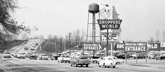A great old-time sign points the way in to the Shopper's World in Highland, Indiana (Courtesy of Eric Vedowski)