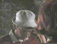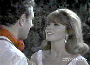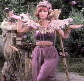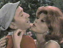 Gilligan has found the "Eye of the Idol" which is purported to grant three wishes to its finder. After using up his first wish and remembering to save the last one for a rescue from the island, Gilligan becomes stressed out trying to think of what the second wish should be. Enter Ginger, who escorts him to a hammock and proceeds to relax him with her silken voice and guided imagery. It works too well: he falls asleep and she has to awaken him. Ginger's persuading Gilligan to wish he were a movie star (with herself as his leading lady) raises the question of whether her relaxation skills were performed out of concern for Gilligan's well-being or her own benefit. But there's no doubt about her objective in the scene described below... |