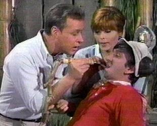 Sure enough, Gilligan falls under Ginger's hypnotic spell. Some experts in the field say that anyone can be an effective "operator" and that the subject actually allows him/herself to be hypnotized. It would have been interesting to have sat in on the writers' discussions for this and the previously-mentioned scene. They apparently reasoned that Ginger got into the Professor's island library and boned up on the subject. |