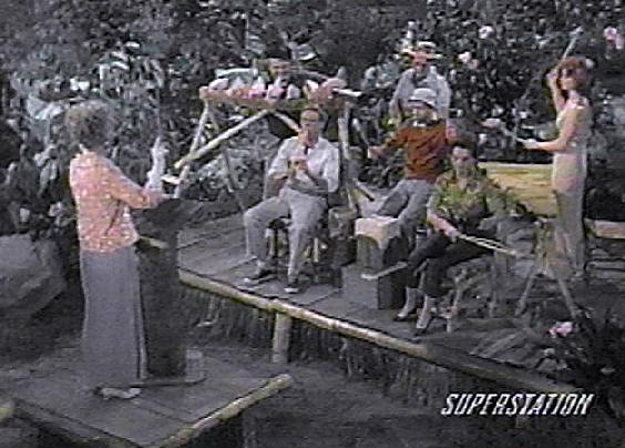 | Gilligan's impressive jungle drum playing inspires Mrs. Howell to form a symphony orchestra with each castaway playing a different instrument. Lovey is the conductor, Mr. Howell plays the triangle, the Skipper uses conch shells as a wind instrument, the Professor plays the flute and Mary Ann is on the musical saw. Unfortunately, Gilligan's drumming sends an inadvertant message to a tribe of savages who think they're under enemy attack and pay the castaways a little visit. |