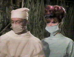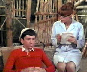 | After Gilligan takes a nasty fall from a tall tree, he believes his nose is broken and insists the Professor operate on it. He obliges, and the others assist him including Ginger, who makes for a most glamorous surgeon's assistant, as the picture suggests. |